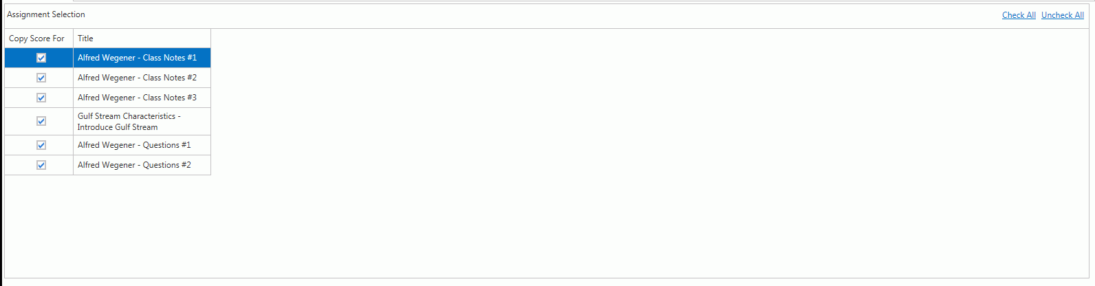 Assignment Selection: Select the Assignments you want to copy scores from.