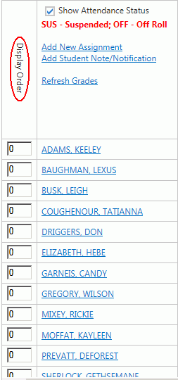 To change the Display Order, enter a numerical order for which you would like them to display. Note: If any students are left with a 0 in the Display Order, they will display before the students with a numerical value.
