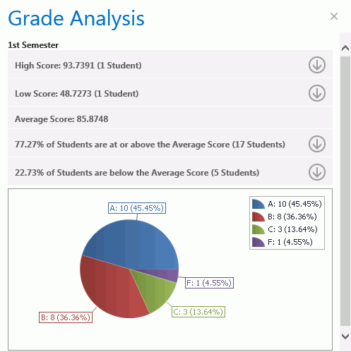 The Grade Analysis Screen displays the students' performance statistics for the specific session grade.