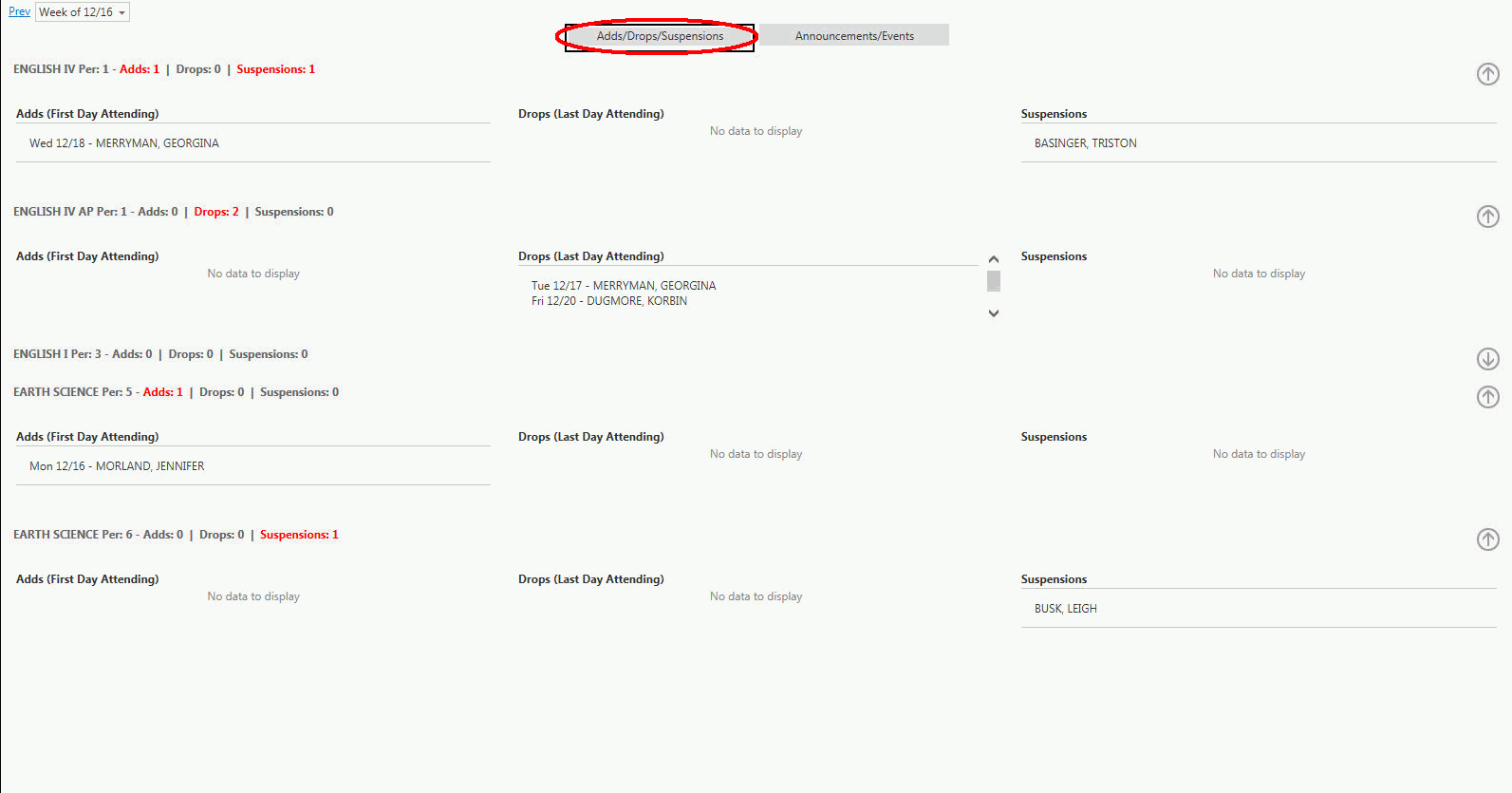 Notice the Adds/Drops/Suspensions Tab: