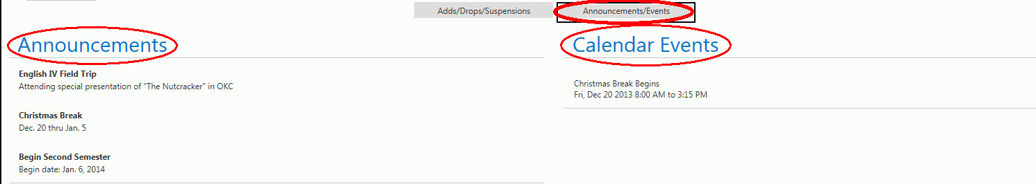 The Announcements/Events Tab displays announcements created by the Site or District for the week selected. The Calendar Events from the school calendar are created in i-SIS and will also display here.