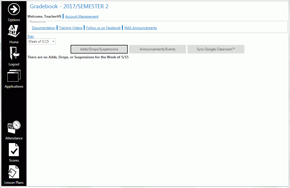 You can also select the School Year and Session for which you want to work. The Application defaults to the current School Year and Session. You will also notice this is where you access Section Settings, Announcements (entered by the Instructor) and Student Notes.