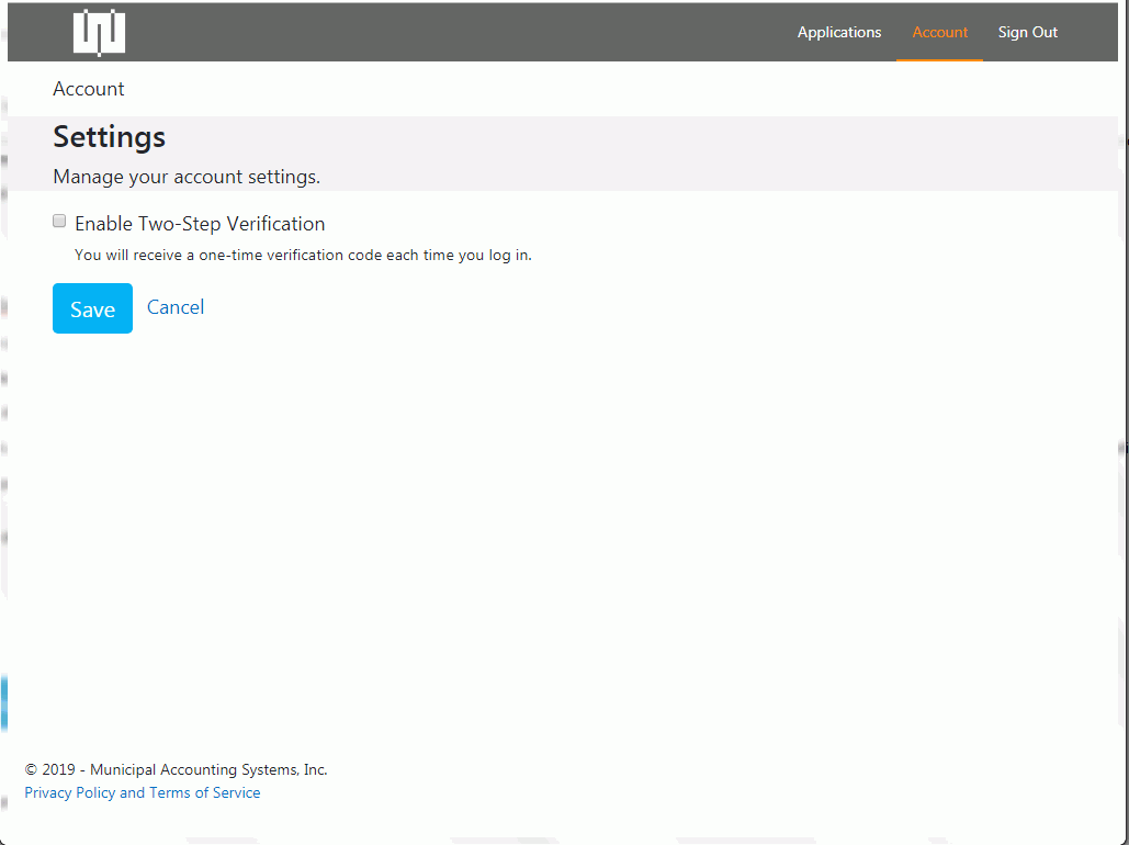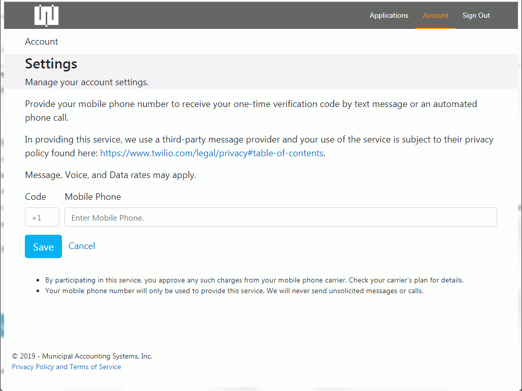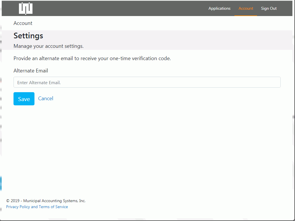 The Settings screen will appear. If you do NOT enter an alternate email, or a mobile phone number, the system will use your Recovery Email when sending a verification code each time you login.