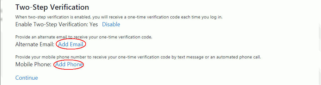 You may add an alternate email AND/OR a mobile phone number in order to select which method you want to receive the verification code each time you login.