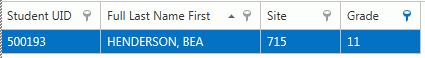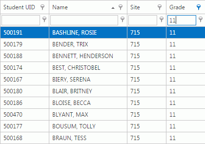 Click in the Grade Row Filter Field and enter 11. (Note: The row filter is defaulted as a begins with field. This means you may enter the numbers or letters the value begins with and the system will locate those records. Therefore, if you are filtering for ninth grade Students, you cannot enter just a 9, you must enter 09.)